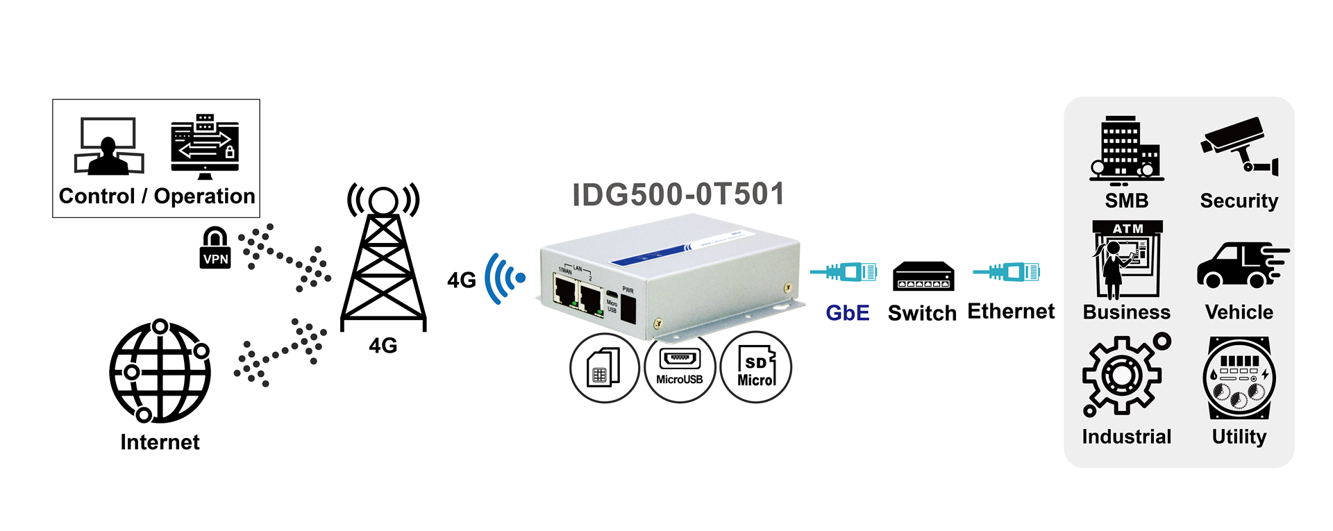 | ‧ | Compact and easy to be integrated into solution. High speed device covers LTE Cat4 and with two ports Giga LAN . GPS enables location tracking. Micro-SD used for log storage. Micro-USB for future expansion. |