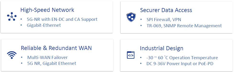 | ‧ | The IDG780 has various interfaces include 5G-NR cellular and Gigabit-Ethernet to provide internet uplink. It provides capability of WAN extender and can handle different networking interfaces to have a robust connection for end devices. Beside the DC 9-36V power input, it also has a PoE-PD input with the configurable LAN/WAN port to make the deployment more flexible. Industrial design also makes the device to operate in a harsh environment. 5G-NR cellular helps the device to replace original Gigabit-level fixed line and make the service available where people need it. |